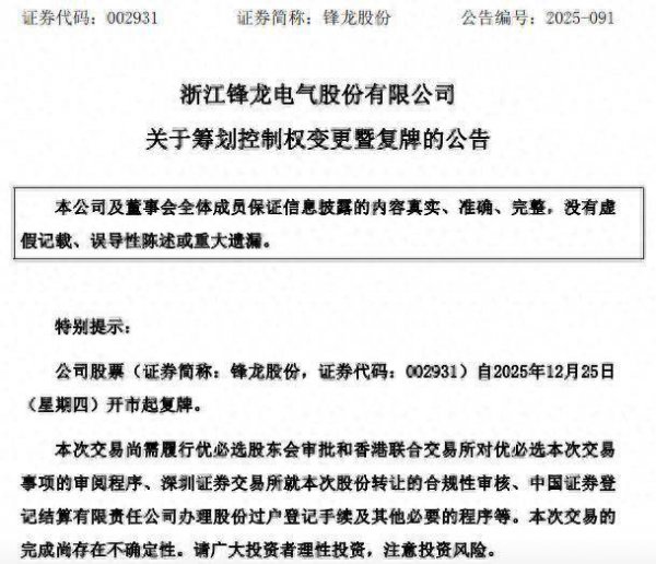 12月24日晚间,A股上市公司锋龙股份(002931.SZ)与港股”东说念主形机器东说念主第一股“优必选(09880.HK)同步抛出重磅公告,优必选拟入主锋龙股份,后者实控东说念主将变更为周剑。锋龙股份股票自2025年12月25日开市起复牌。